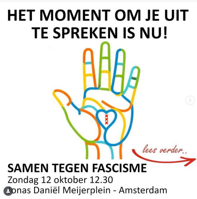 Come to Jonas Daniël Meijerplein in Amsterdam on October 12th at 12:30 PM and join this demonstration against fascism, giving a deafening rebuttal to the hatred being spread on Dam Square at that moment.